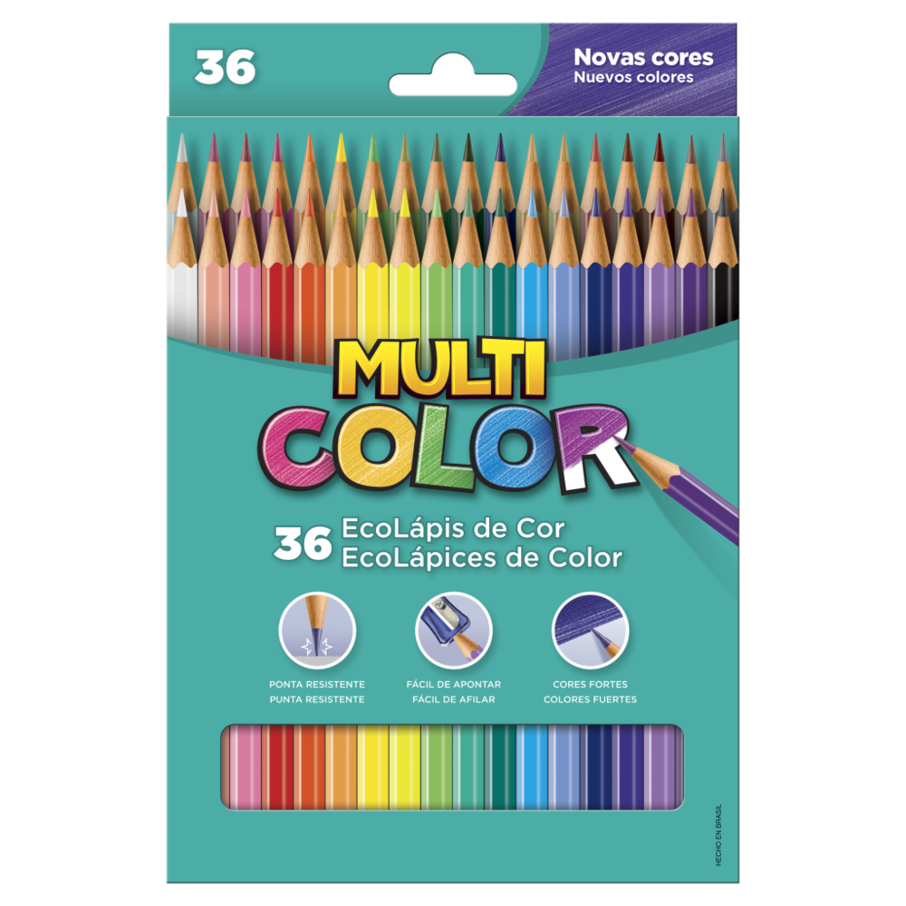 Lápis de Cor Multicolor com ponta resistente, fácil de apontar e com cores fortes e vibrantes. Lápis produzido com madeira reflorestada. Contém estojo de 36 Cores